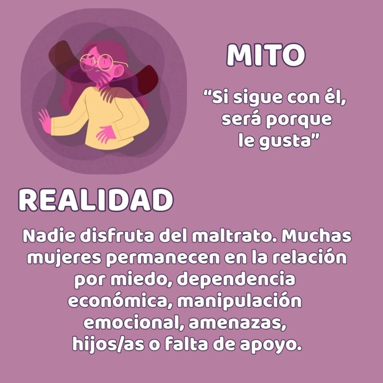 REALIDAD: Nadie elige vivir violencia. Las mujeres que permanecen en una relación de maltrato lo hacen por múltiples factores: miedo, dependencia emocional o económica, falta de apoyo, presión social o incluso por proteger a sus hijos e hijas. Salir no es fácil, es un proceso.